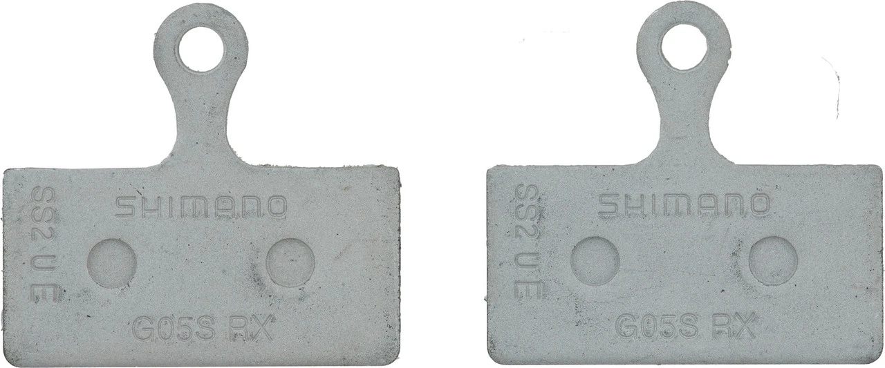 Die Shimano Bremsbeläge G05S-RX haben einen organischen Belag auf einer Stahl-Trägerplatte ohne Kühlrippen. Sie eignen sich für ältere XTR Bremsen, für XT, SLX, Deore, Alfine und für eine Reihe von gruppenlosen 2-Kolben-Scheibenbremsen. Im Vergleich zum Modell G03S konnte die Lebensdauer um ca. 40 % verlängert werden. Wie alle Kunststoff-Beläge von Shimano überzeugen die G05S-RX durch ihre Geräuscharmut und ihre gute Dosierbarkeit. Die Bremskraft ist überdurchschnittlich – bei optimaler Wärmeisolierung. Damit leisten diese Bremsbeläge sowohl bei Trockenheit wie bei Nässe zuverlässig ihren Dienst.